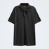- Concealed snap fasteners under the placket complete a sleek look.